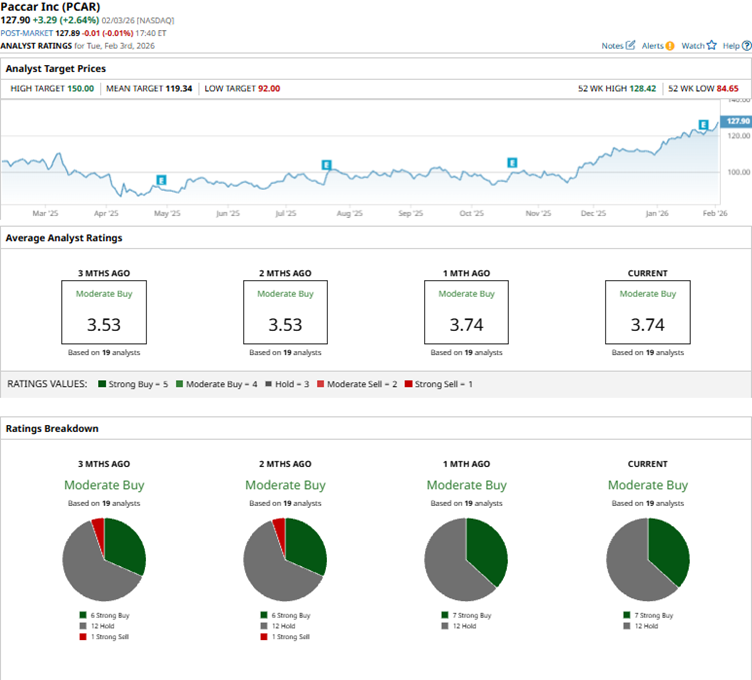 PCAR’s mean price target of $119.34 indicates a 6.7% downside over current market prices. However, the Street-high price target of $150 implies a potential upside of 17.3%.